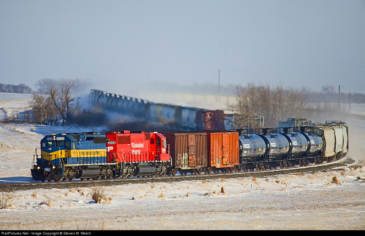 Two EMD's lead #499 into the Anamoose curves on a bone chilling cold day. Air temp was close to -20 and wind chill was -50!