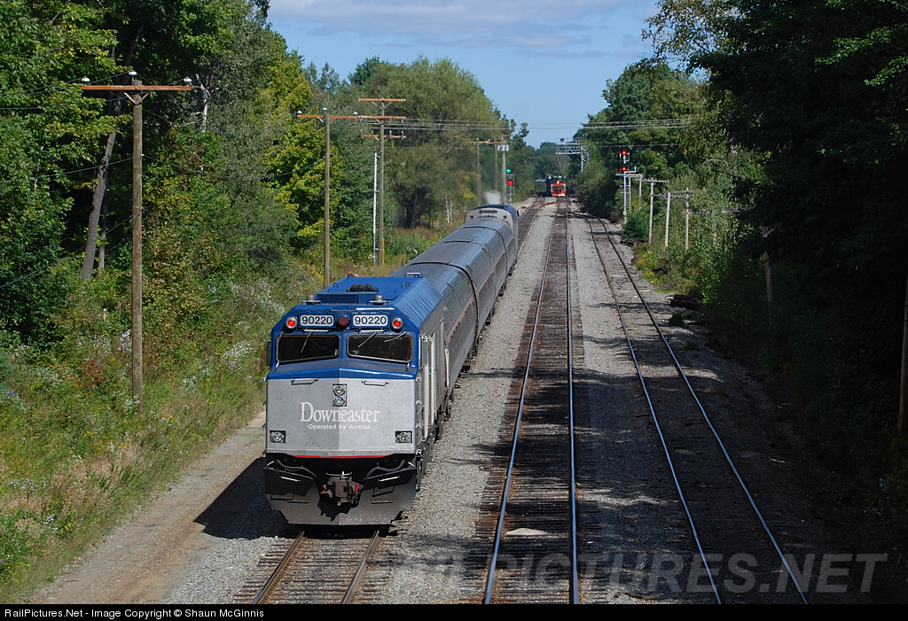 | Guilford Rail Systems Office Car Special approaches Dover as an eastbound Downeaster leaves the station behind. The OCS train was on it's way to Boston on a clear September day. |