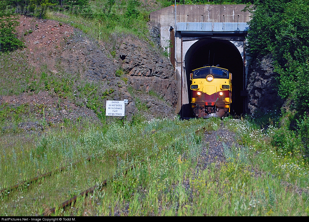 | The ABBB set of Cliffs Erie locomotives and 24 cars of chips and fines pokes their head out the west portal of Cramer Tunnel as they continue inland from Taconite Harbor back to CLiffs Erie property near Hoyt Lakes. This was a special run for these cars and engines as they were involved in the clean-up project of the former Erie/ LTV Steel ore dock on the shore of Lake Superior after the mine closed and product was not being shipped anymore. Today what's left of the dock, railroad and plant site sit idle. |