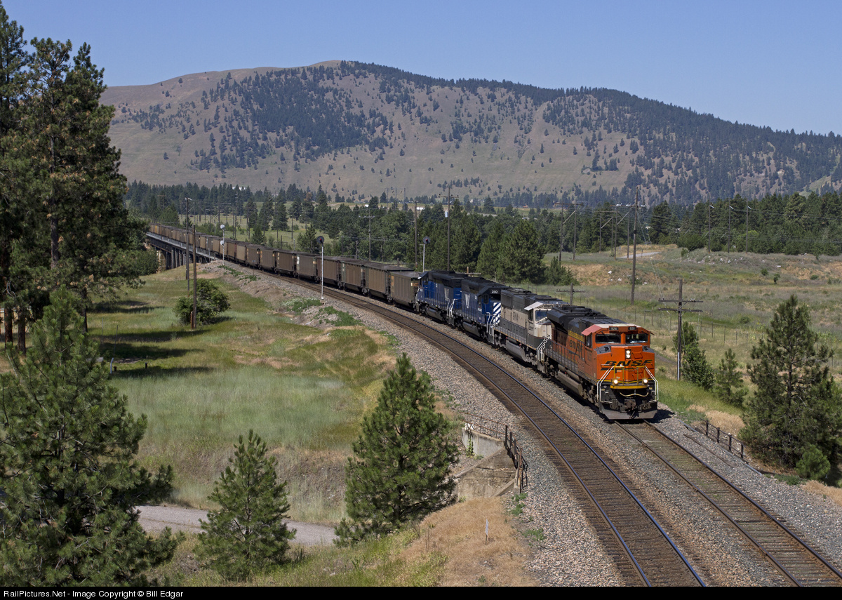 BNSF 9211 (SD70ACe) leads BNSF 9704, an SD70MAC, MRL 250, an SD40-2, and MRL 330, an SD45 with an empty coal train eastbound into the siding at the west end of Bonner, Montana for a meet. The train is crossing the Clark Fork on the former Northern Pacific mainline just east of Missoula.