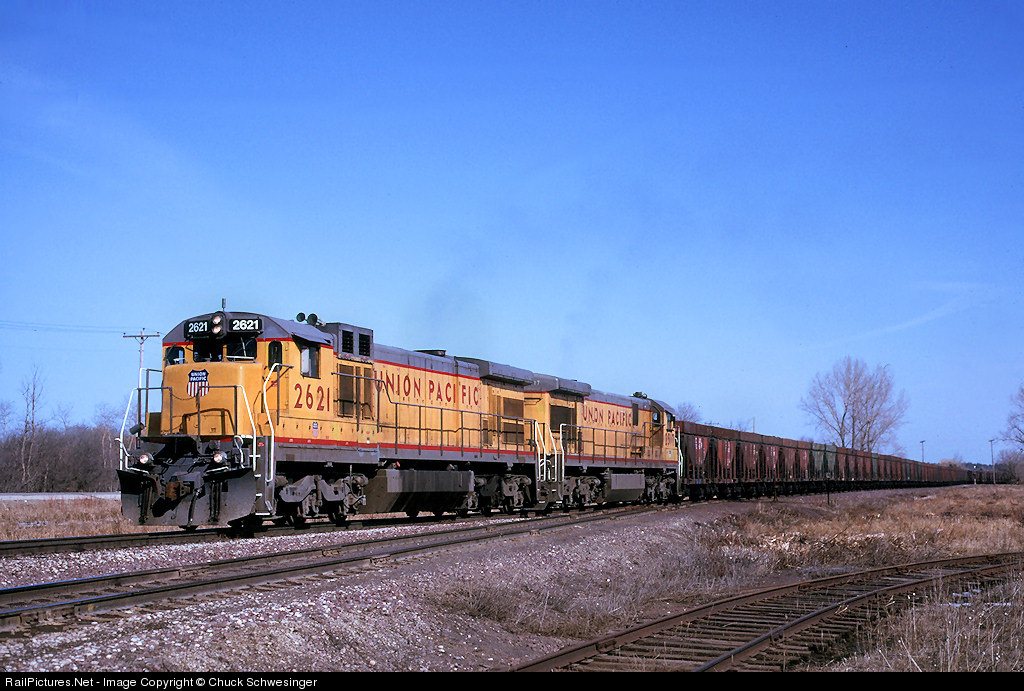 | Probably one of the most worthy looking replacements of the CNW C628 fleet that called Escanaba home was a handful of UP C36-7's that made there way into service on the ex CNW ore lines. UP 2621 and C30-7 2517 have loads rolling past the ore dock lead and a seldom used E&LS track on the far right in Wells. |