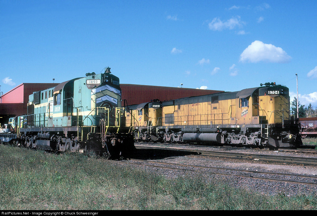 | The CNW C628's didn't often tie up at the LS&I Eagle Mills shops, but on rare occasions could be found there due to problems on the CNW line to Escanaba or trouble at the mines. Also if awaiting an all-rail train to be loaded they could be found at Eagle Mills shop. I don't recall the reason for this appearance but it probably is the only day I shot a C628 set at Eagle Mills resting alongside LS&I power. With the C628's being only a couple of months from retirement the chances of many more encounters were slim. |