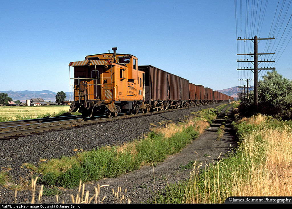 Rio Grande wide vision caboose 01522 trails D&RGW train #673, approaching United States Steel's Geneva Works in Vineyard.