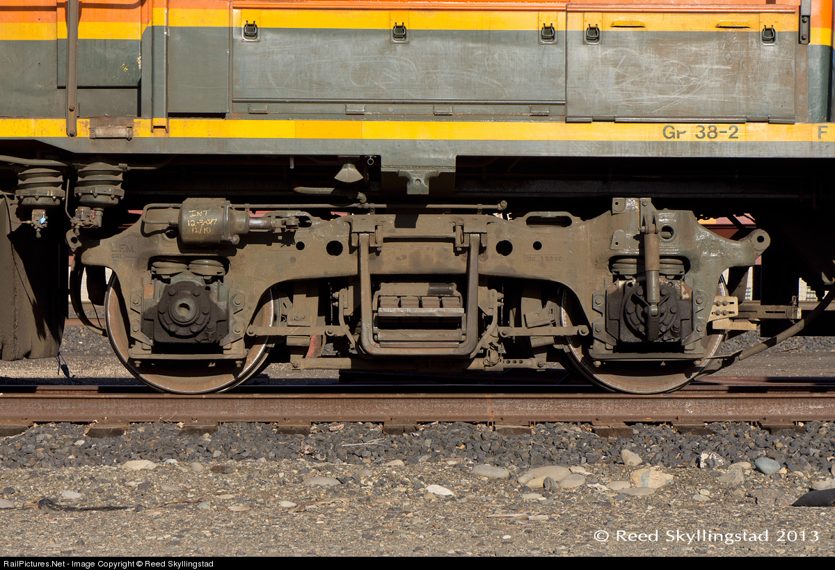 A Blomberg "M" type truck on a BNSF GP38-2. The Blomberg "M" type truck is based off of the Blomberg "B" type truck, which has been in service since 1938. The first locomotive that used the "B" type truck was the EMD FT, starting in November 1939. The last locomotive to use this truck was the GP60, which ended production in 1994. This truck has one brake cylinder per axle, shown here above the rear wheel. A large leaf spring in the center absorbs vertical movement, while hydraulic shocks on the front axle absorb horizontal movement. The Blomberg truck is named after Martin Blomberg, who joined EMD in 1938. He was a Swedish-American engineer who designed the truck. Blomberg also help design the AAR type "A" switcher truck. Two air dryers can be seen in the middle left of the photo, right in front of the fuel tank.