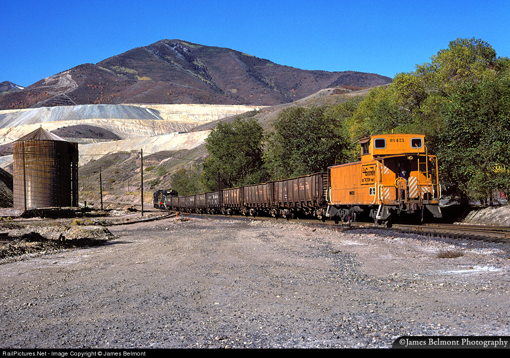 Rio Grande's Midvale Tramp local departs Lead Mine in Bingham Canyon with nine empties for reloading scrap at Proler Steel near Copperton. D&RGW's remaining trackage leading up to Bingham Canyon is long gone now.