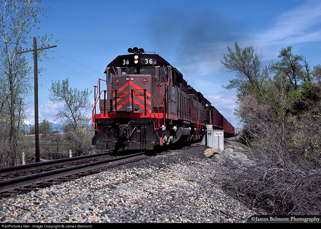 | One probably wouldn't expect to see a pair of McCloud River Railroad SD38s dragging a long freight train in Utah. The power short Union Pacific leased two of these EMDs from McCloud between 1988 and 1989 and assigned them to work the LUF51 local between Salt Lake City and Provo. UPL (Union Pacific Lease) 36 and 37 are pictured hauling cars from Geneva Steel across the Provo River bridge near Provo on May 7, 1988. |