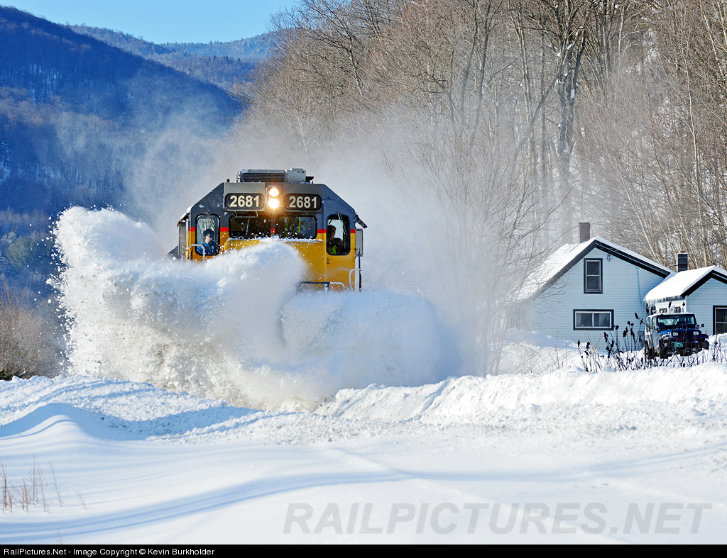 Following Winter Storm "Nemo", operations on the New England Central Railroad were shut down through Saturday afternoon, when a 'Driftbuster' light engine move was dispatched out of St. Albans, Vermont to Brattleboro. NECR SD40M-2 2681 and 2714 do the honors as the train rolls through West Braintree, Vermont on the Roxbury Subdivision.