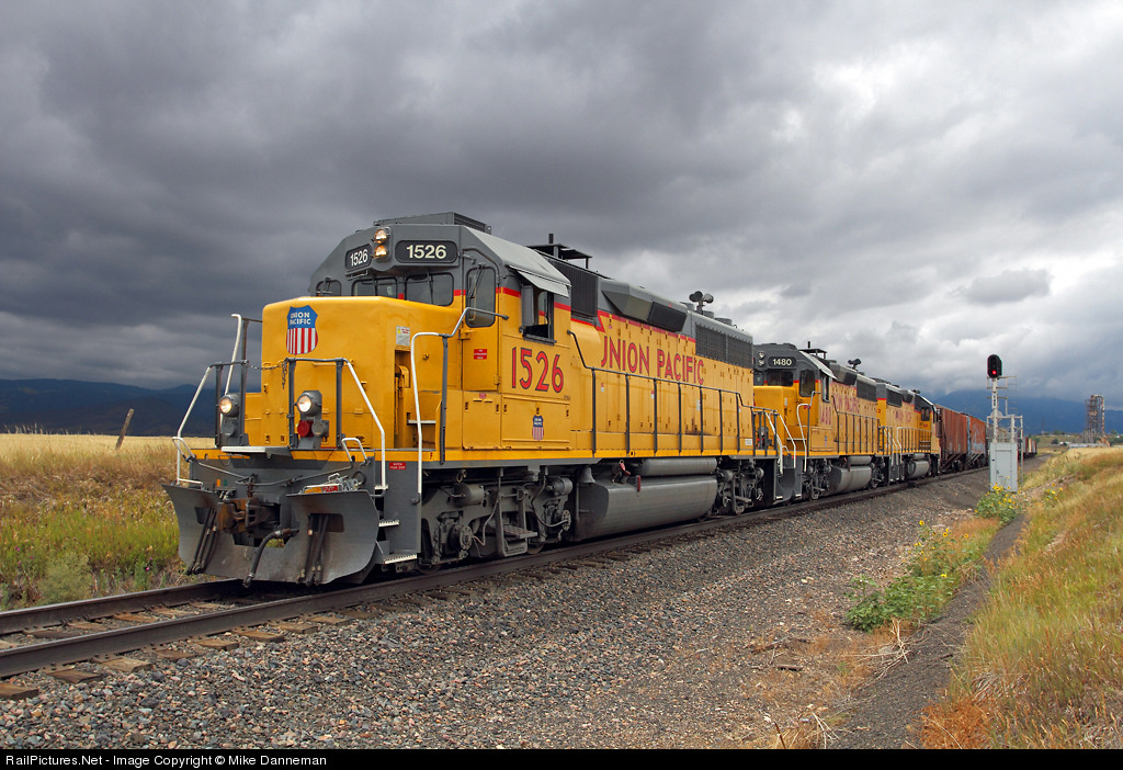 Union Pacific’s West Local returns to Denver heading downgrade at mile 14.5 west of Leyden, Colorado, on July 8, 2012. Three rebuilt GP40-2s (two rebuilt from Southern Pacific GP40s, while one is a former Cotton Belt locomotive) lead the train back to North Yard.