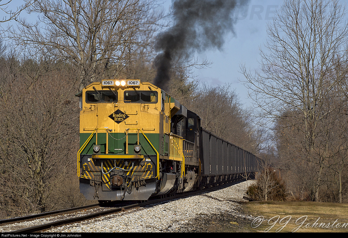 The Reading unit looks like a steam engine as the GEVO behind it puts up some smoke while pulling a cut of coal cars on a slight grade.