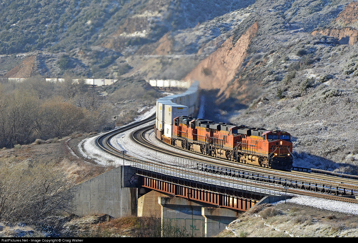 On February 9th, 2013, BNSF Railway train Z-SBDALT9-09A, a 6526' (without locomotives, 6891' with them), 4275 ton intermodal train heading from San Bernardino CA to Alliance TX, threads its way around the curves as it grinds its way up southern California's Cajon Pass. Just beyond this crossing of Cajon Creek is the site of the old Cajon station, where the three BNSF mainlines split, with two of them taking a slightly more circuitous route up the hill. A quartet of modern GE power is on the headend: ES44DC 7209, ES44C4 6833, Dash 9-44CW 5072 and ES44DC 7445. The elevation here is just under 3000', and there is a light dusting of snow from the previous night's storm.