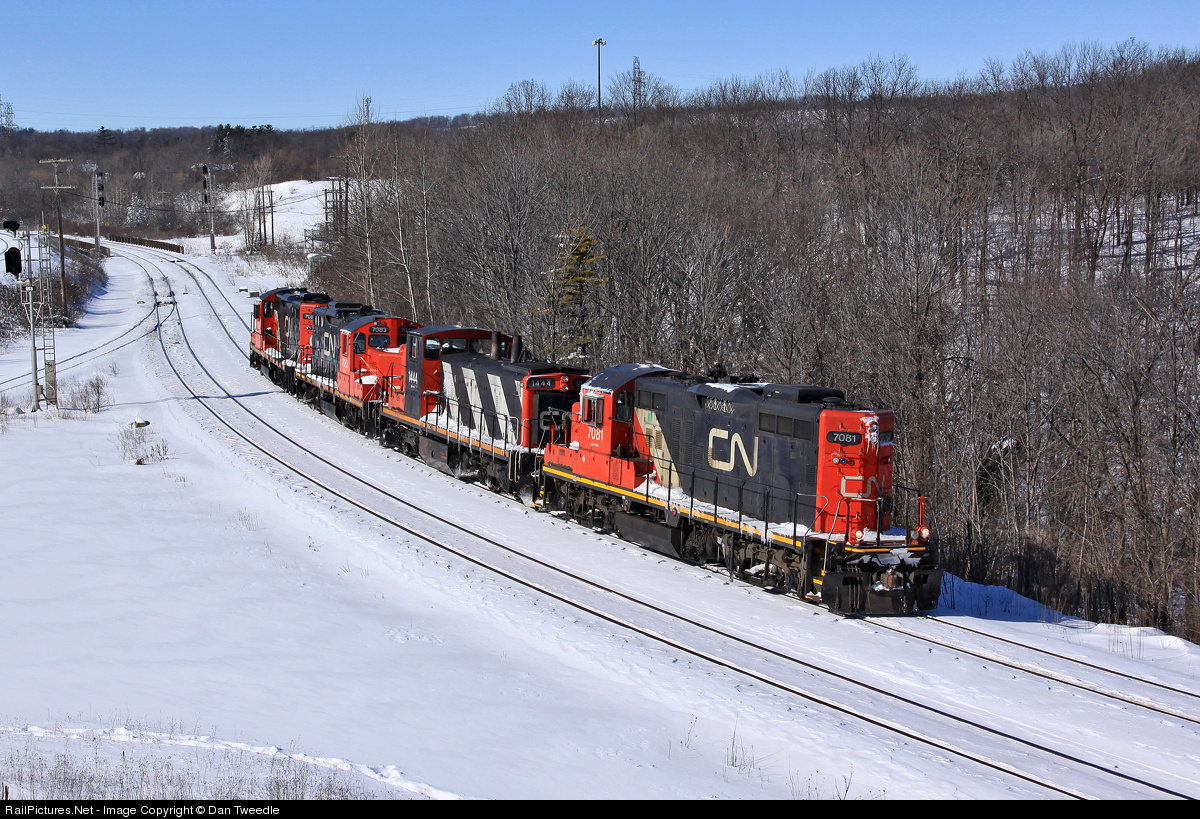 | CN 7081 runs LHF back into Aldershot Yard after pushing 399 up the escarpment from MP 3 to Paris Junction. 399 then received a new crew and 550 was cut from the tail end allowing the four locomotives to travel back to Aldershot. Power was CN 7081, 1444, 7083 and 7080. |