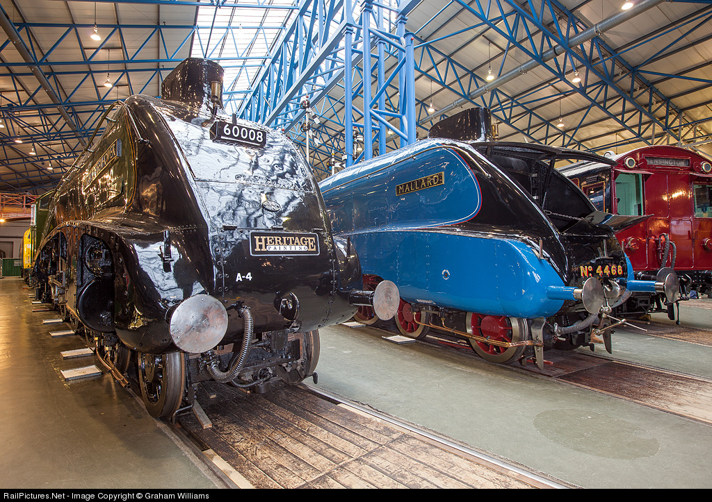 | As preparations proceed towards the reunion of the six remaining A4s at the National Railway Museum in July this year, the latest milestone is the repainting of 60008 Dwight D. Eisenhower. This loco is visiting from Green Bay WI for a year.Here we see the shiny loco next to classmate and World record holder no. 4468 Mallard on display in the main hall of the museum. |