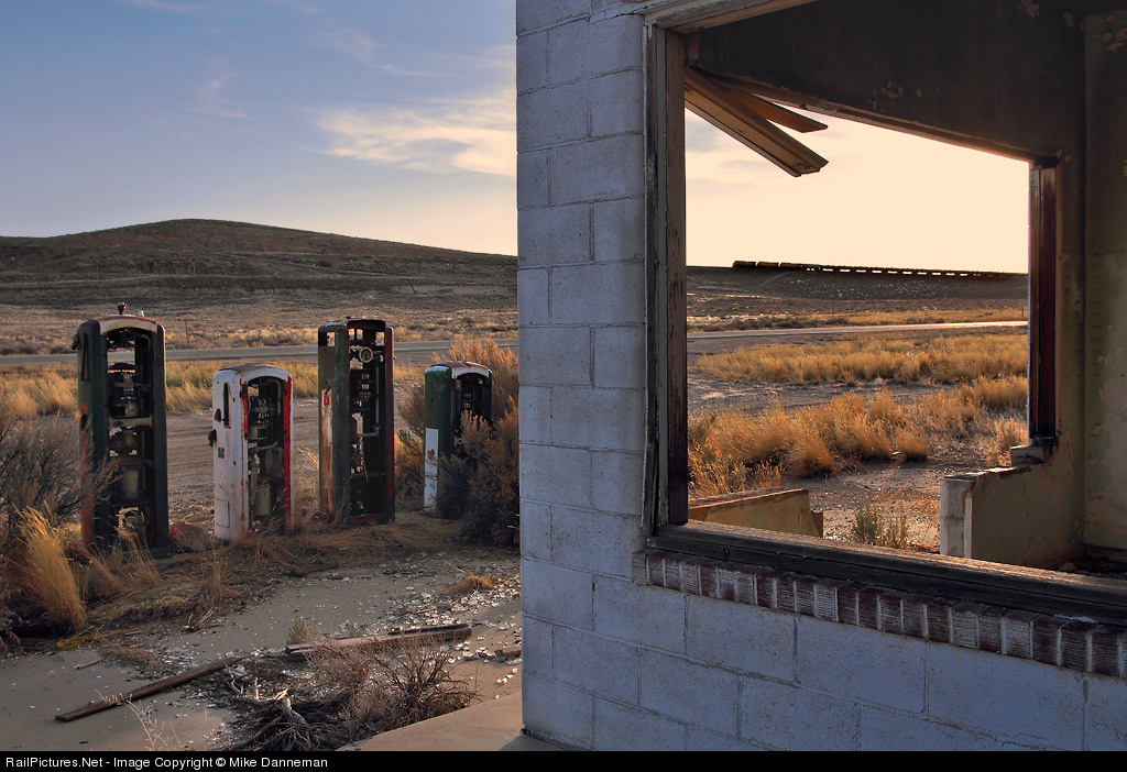 A unit oil train is framed through the empty window of an abandoned Sinclair gas station along old U.S. 30 through James Town near Green River, Wyoming, on the afternoon of March 12, 2012. Sunset is approaching on this busy piece of Union Pacific trackage on Peru Hill.
