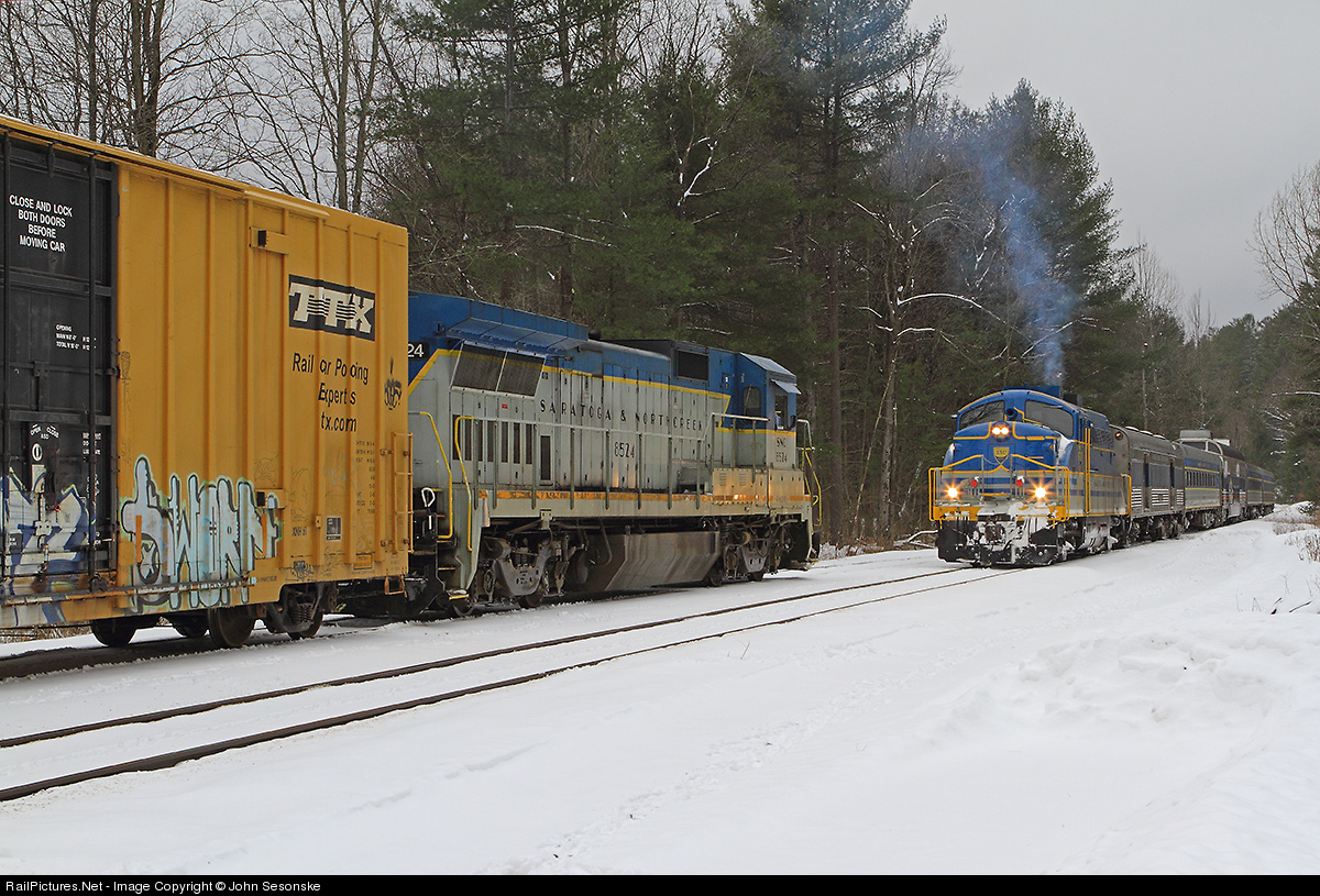 | Historic Meet. The very first SB SNC freight holds the siding at Thurman for a NB passenger deadhead move out of Saratoga. The freight, running under the old D&H SC5 symbol, originated in North Creek. This is likely the first time since 1956 that a passenger and freight train have met on the ex D&H Adirondack branch. |