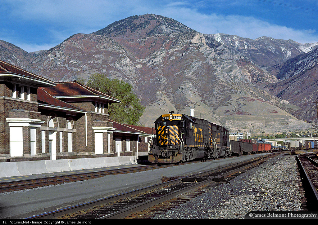 Long before it gained notoriety leading the dirt train local out of Helper, Rio Grande 5390 works Grand Junction to Roper freight #151 west through Provo on October 15, 1986. The Rio Grande passenger depot was in the early stages of dismantling on this day. Salvaged brick by brick by the highest bidder, in weeks the sturdy depot (opened in 1910) would be gone forever.