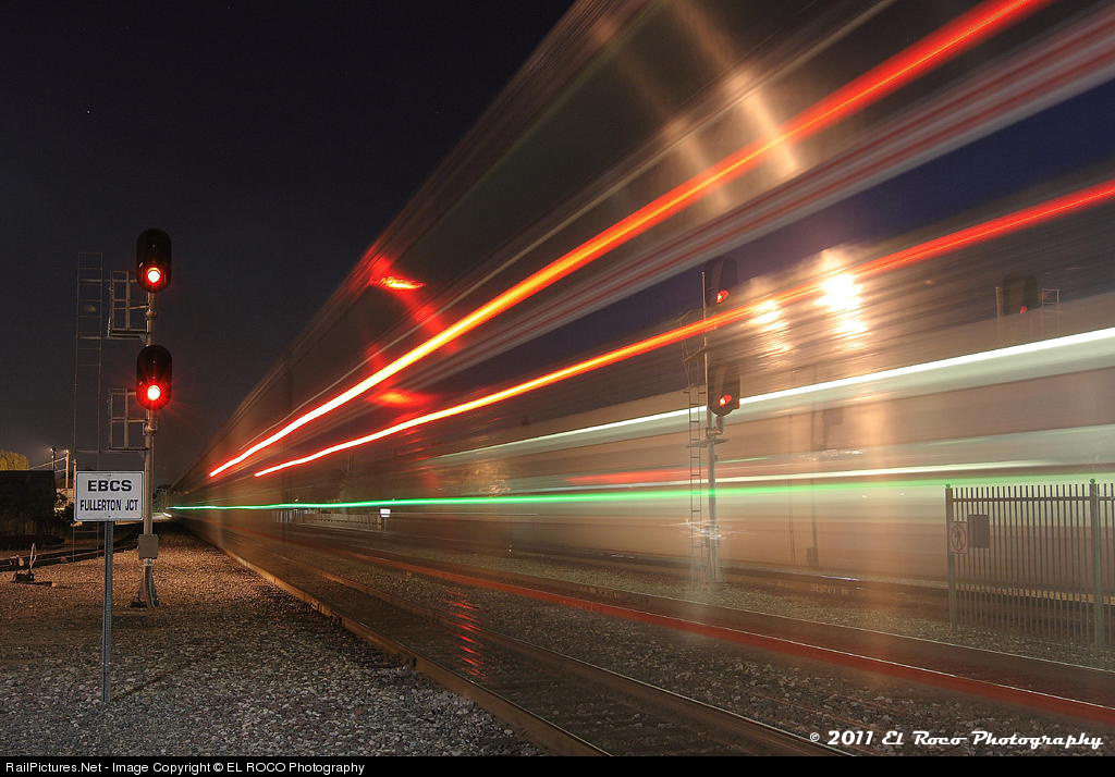 | A Cacophony of Light - A view of the three signals at EBCS Fullerton Junction as the Eastbound Southwest Chief, Amtrak Train Number 4 goes by on Main #1 and a Southbound Metrolink train pulls out of the station on Main #3 to the far right. |