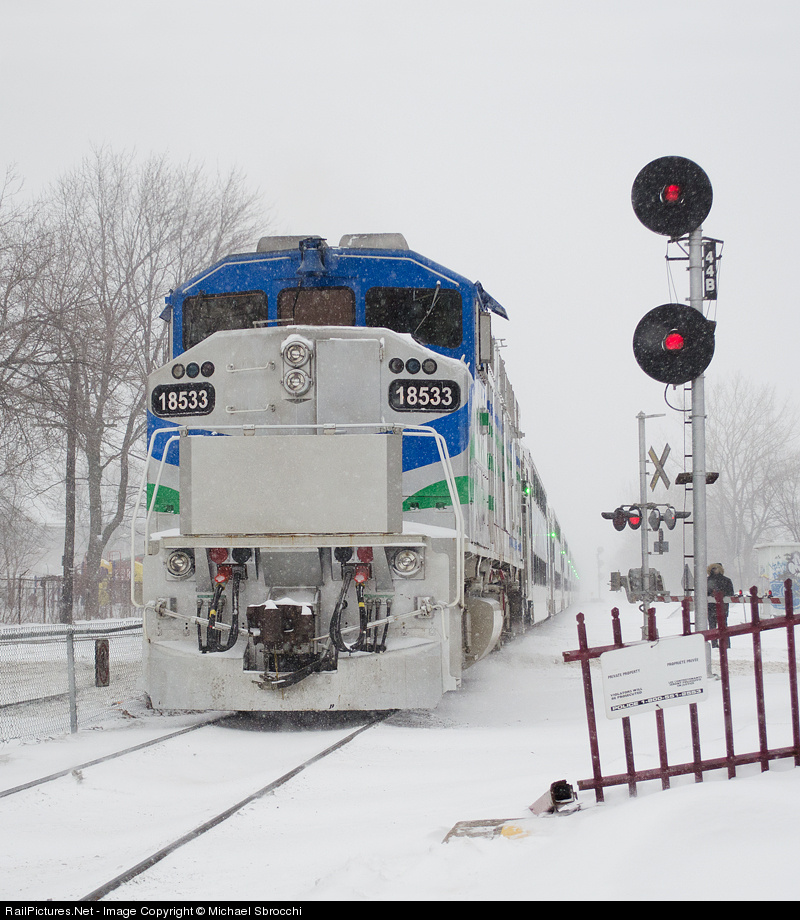 | AMT E121 had a locomotive on each end, an F59PHI on the head end, and RBRX 18533 on the rear end pushing. RBRX 18533 is ex-GO 533 with the Chicago "Mi-Train" paint scheme that this particular unit sports. The Mi-Train project ended up being cancelled, but the paint scheme ended up staying on this locomotive. |