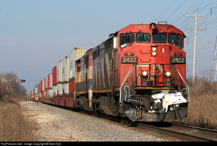 | A pair of C40-8M's, CN 2422 and BCOL 4608, lead Q116 through Joliet, approaching Turner. |