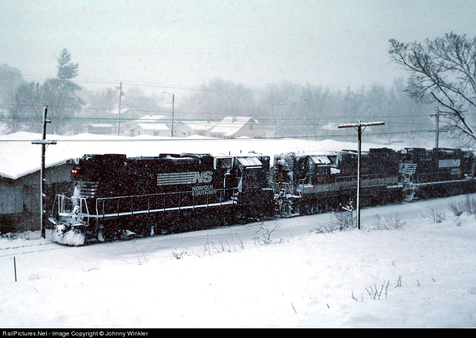 A trio of NS/Southern EMD power leads a freight train through Morristown during an April snowstorm in 1987.