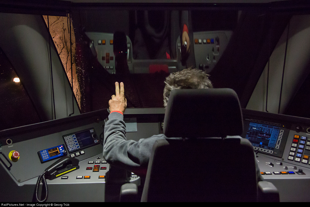| The driver of the "Allegra" ABe 8/12 # 3512, running the "Engadin Star" service from Landquart via Klosters to St.Moritz, is greeting his collegue on a oncoming train inside the 19 kilometer long Vereina tunnel between Klosters and Saglains/Susch. |
