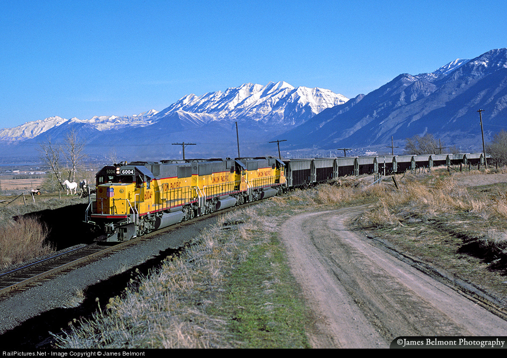 A pair of horses don't appear to be phased one bit by the passage of Rio Grande coal train #734, approaching Sutro Cut on March 19, 1988. The snowy flanks of 11,749 ft. Mt. Timpanogos decorate the background on a splendid late winter morning in Utah's Happy Valley.