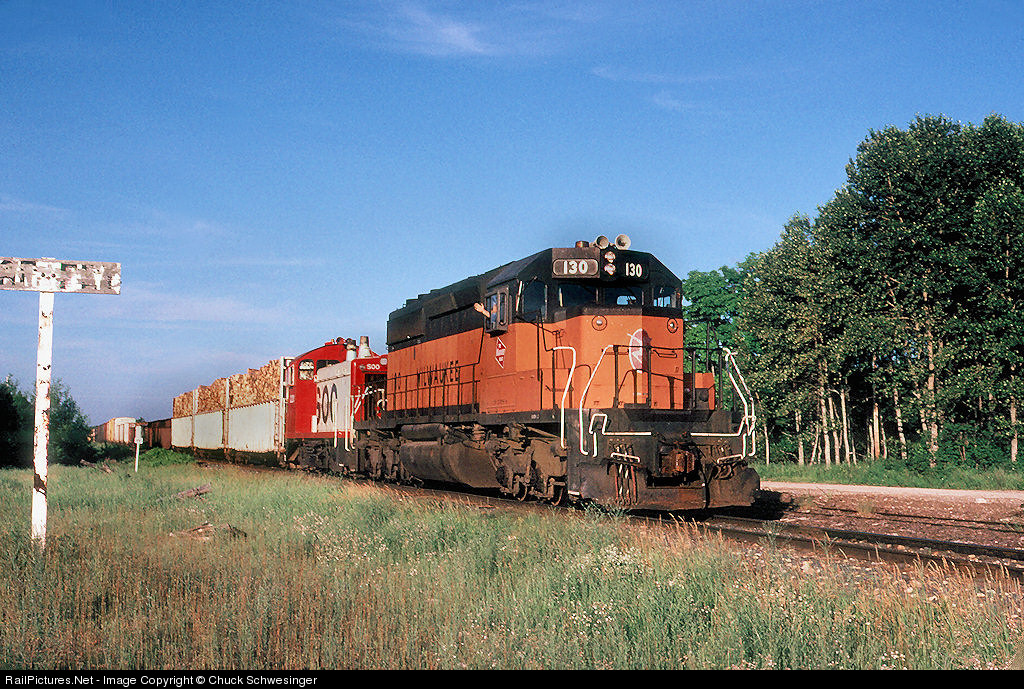 | In the last summer of Soo Line operations in Upper Michigan a Milwaukee SD leads a former Milwaukee SW now in fresh Soo Line Red/Off White/Black west on train 12 with 47 cars at Caffey. |