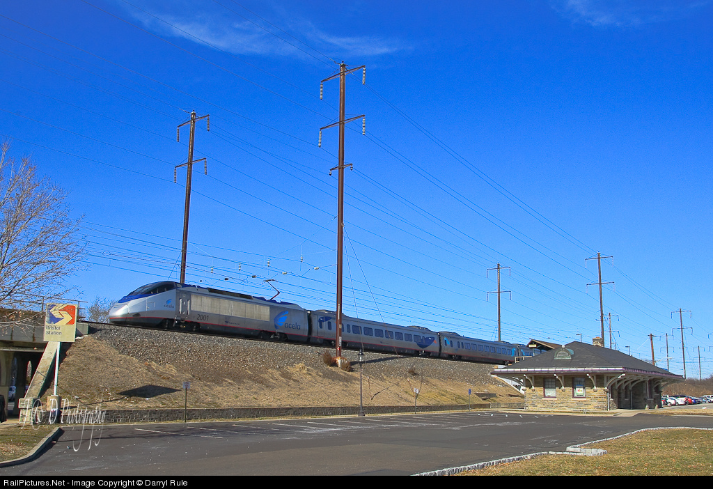| An a crisp and clear President's Day Monday, Amtrak's Acela Express hauls passengers North towards New York's Penn Station on the Northeast Corridor. The train is seen here passing over the former Pennsy station at Bristol which is now occupied by a bread bagel shop. |