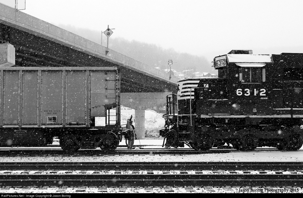 | With snow and winds up to 30mph, the conductor of a "4-banger" of helpers helps the engineer of NS 6312 couple up to the NS 534 with over 120 loaded coal hoppers on a cold day in Johnstown, PA. |