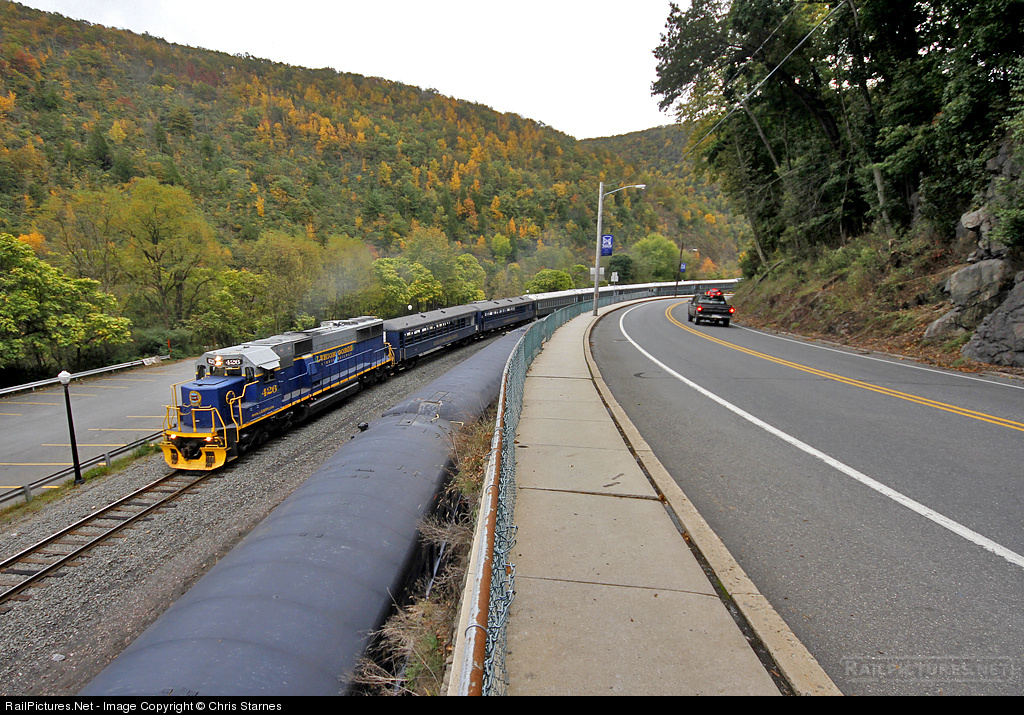 | A cool fall afternoon in Jim Thorpe, PA finds northbound Lehigh Gorge Scenic Railway departing for a quick trip through the Lehigh Gorge State Park behind specially painted Reading & Northern SD50 #426. |