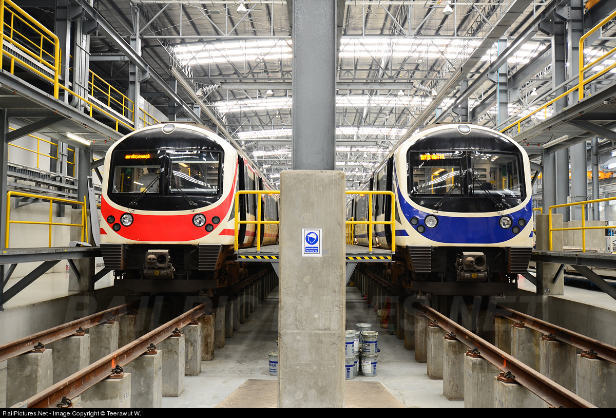 Thailand Airport Rail Link Express Train (Red) and City Train (Blue) in Klong Ton Depot.