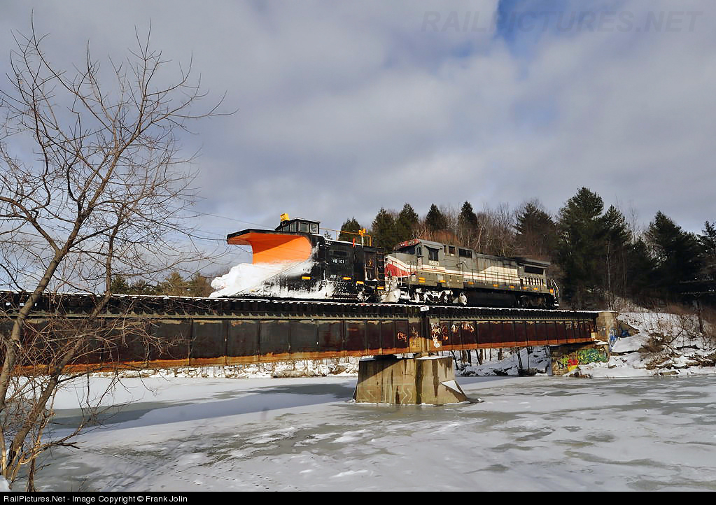 Montreal Maine & Atlantic Plow Extra 8583 West, rumbles across the frozen Massawippi River at Lennoxville.