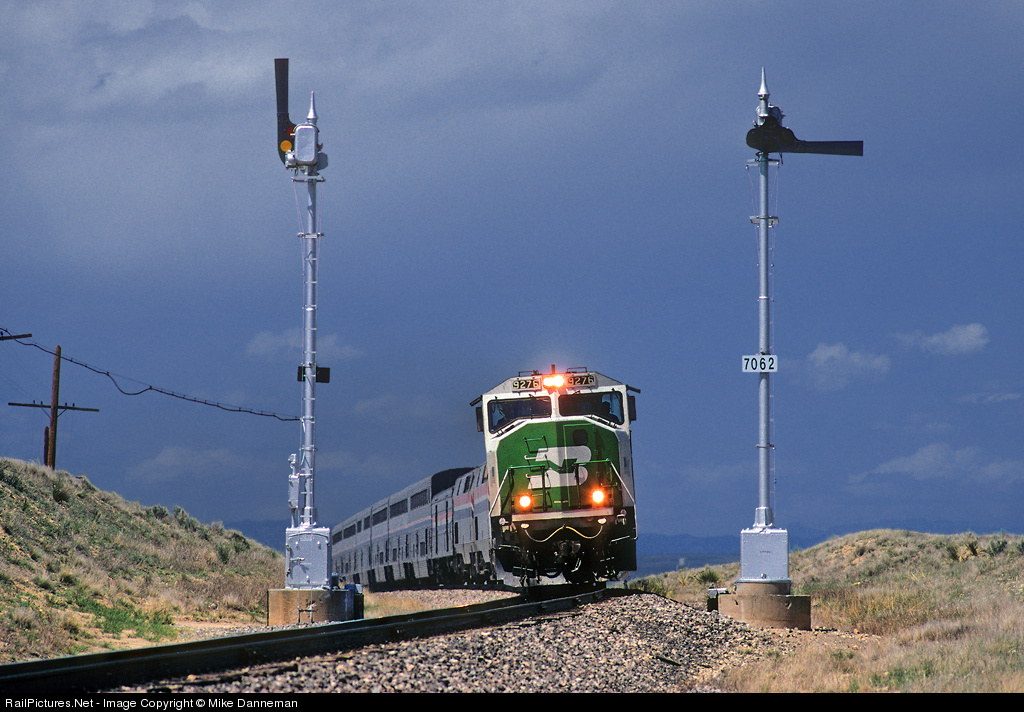 Amtrak No. 3, the Southwest Chief, is about to curve through the mile 706.2 semaphores near Robinson, New Mexico, on May 20, 1999. Apparently some power issues further east on the trip has required the assistance of Burlington Northern EMD SD60M No. 9276 to pilot the train west.
