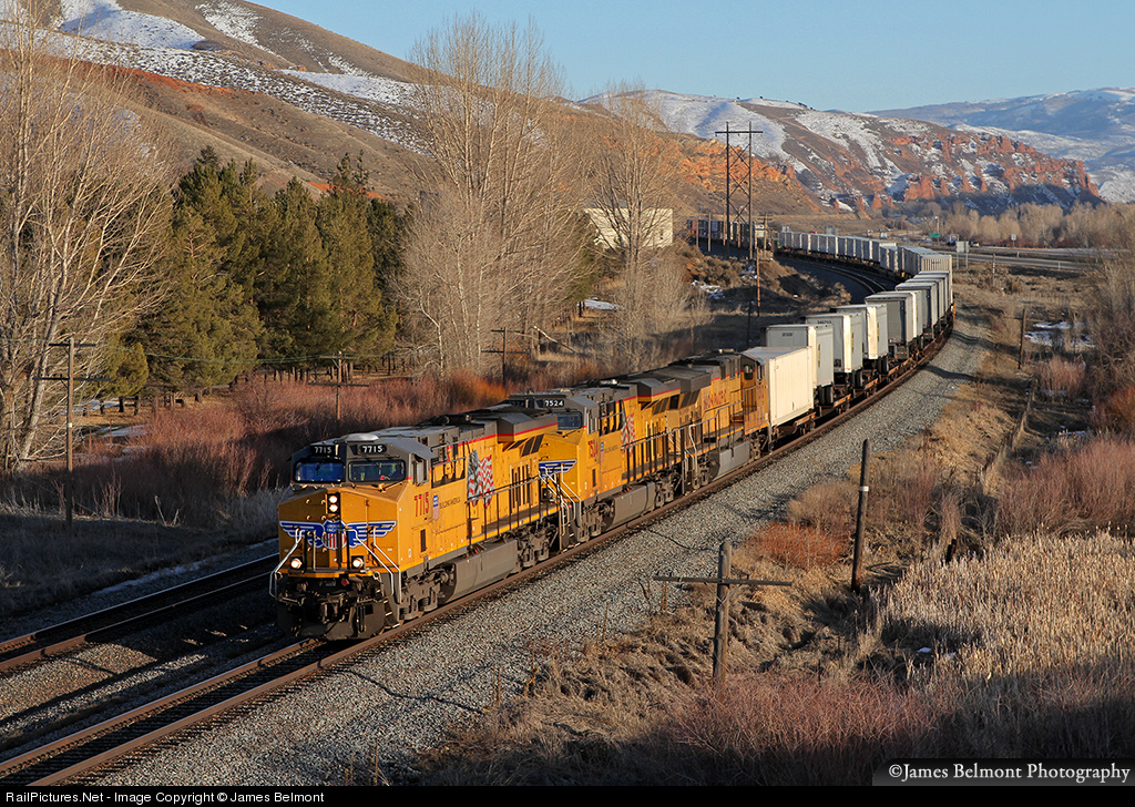 | Three GE motors lead UP's Denver, CO to Salt Lake City, UT expedited intermodal west through the Weber River Valley at Henefer. |