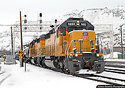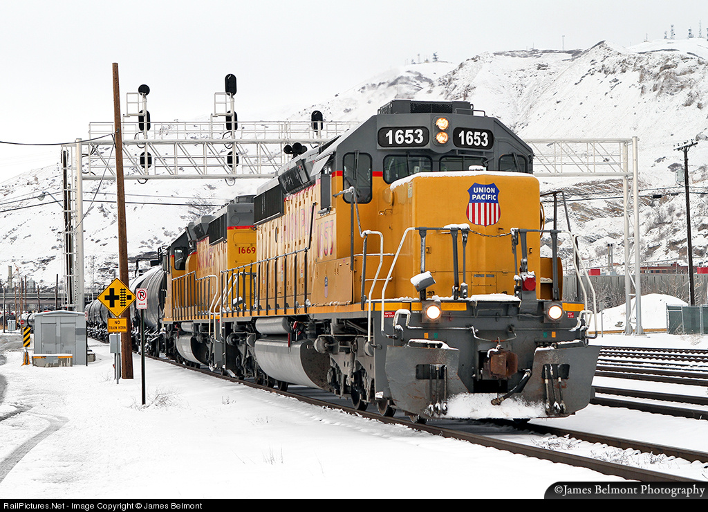 A fine pair of UP rebuilt SD40Ns lead a 19 car YSC53 local west through Salt Lake City on a cold and wintry February 23, 2013 afternoon. The UP 1653 was rebuilt in North Little Rock, Arkansas from the UP 3427, built new by EMD for the UP in August 1978.