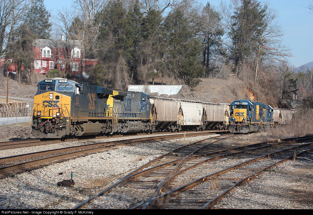 CSX #936 leads a southbound grain train under the NS (S-Line) and past the local CSX power at Marion, NC.
