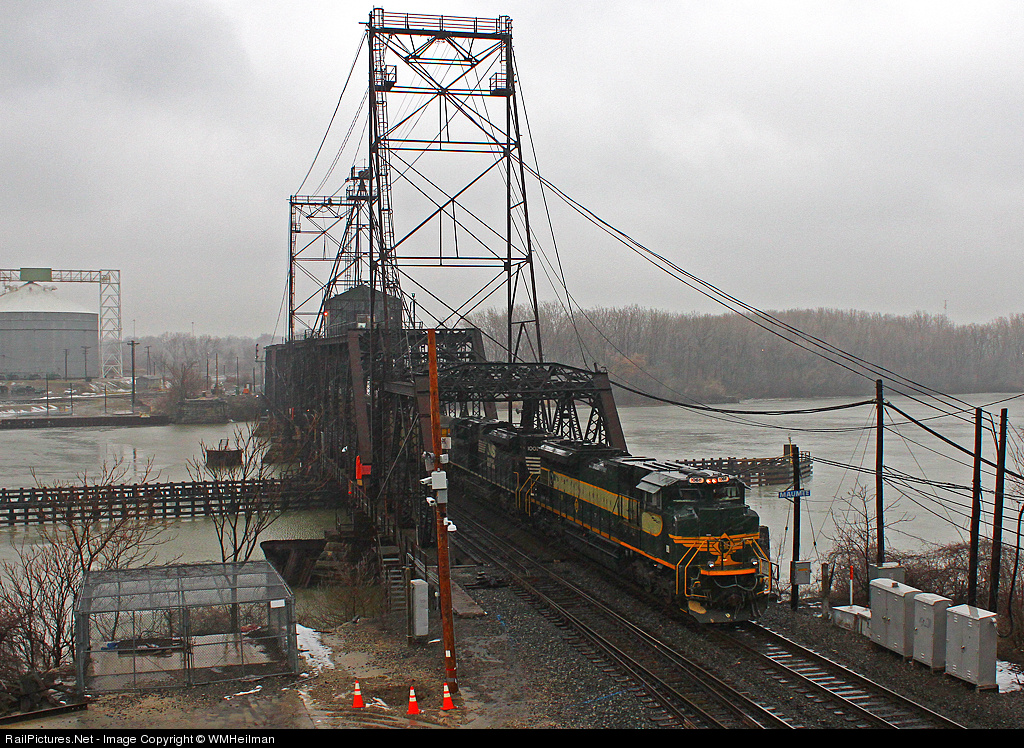 | After a lengthy delay waiting for two hot mail trains to get around them, the new crew aboard 553 eases their empty train across the swing bridge at CP Maumee with the Erie heritage unit in command. |