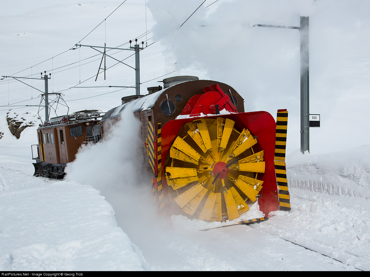 Self propelled steam rotary X rot d # 9213 of the RhB from 1910 during the event "Steam snowplough rides - The Bernina Monster", organized by the Rhaetian Railway. The rotary has in total 6 steam cylinder, powering in pairs the large rotating assembly at the front with a diameter of 2.5 meter, and the two threeaxle driven bogies (System Meyer, 0-6-0+0-6-0).