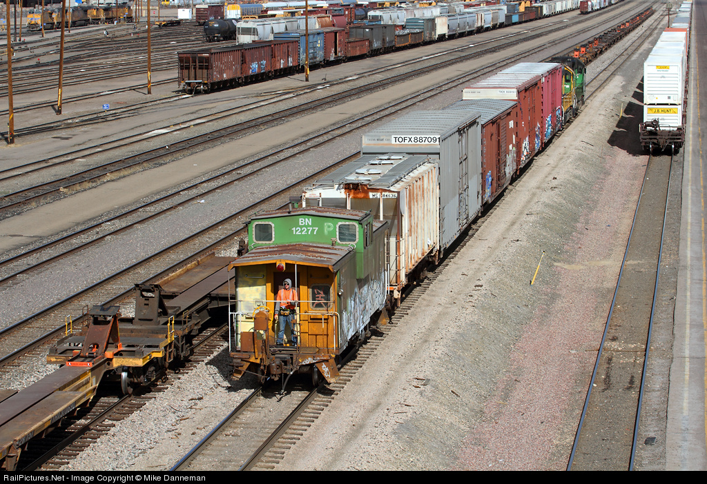 Once used as a place for a conductor and rear brakeman to work a freight train, Burlington Northern caboose No. 12277 is now relegated to a much different life as seen on this BNSF local backing through Rennick Yard at Denver, Colorado, on February 18, 2013. Fading Cascade green and mismatched yellow end paint, broken windows, a lot of graffiti covering years of grime; the once colorful ending to a freight train now serves as a lowly shoving platform.
