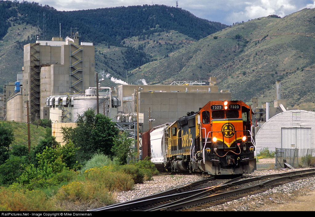 The Burlington Northern Santa Fe beer run to Golden, Colorado, interchanges cars with the Coors Brewing Co. on August 7, 2004. Part of the giant Coors brewery complex is in the background in this view looking up Rattlesnake Gulch. BNSF No. 7323 is a former Canadian National EMD SD40 that was rebuilt to “Dash-2” standards by GEC Alsthom Canada, Inc. for BNSF in 1999.