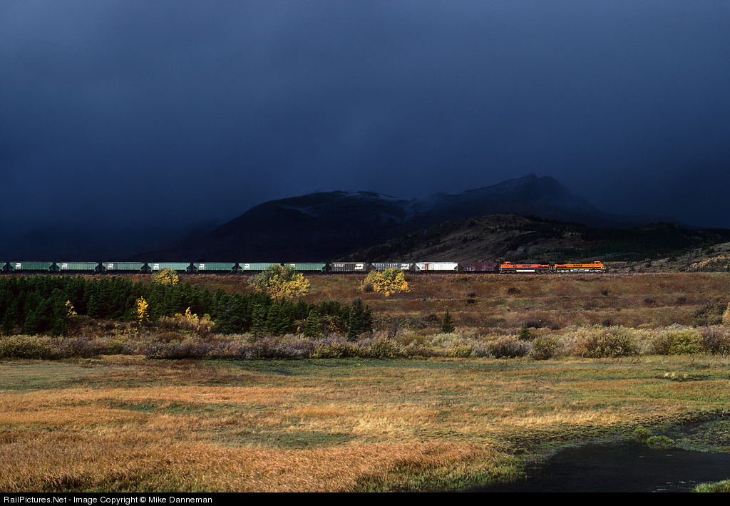 A Burlington Northern Santa Fe grain train travels over a stormy Marias Pass just east of Bison, Montana, on October 4, 1997. At this location, winter is coming!