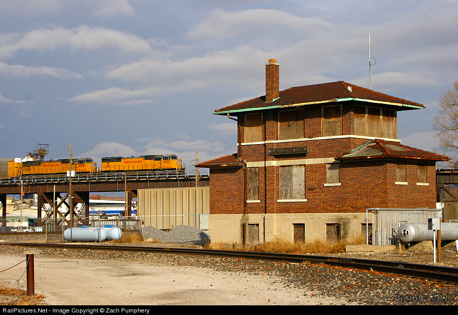 Making another poke out on the KCT High Line is UP Train AAMKB 26. In the foreground is the inactive KCT Tower 14.