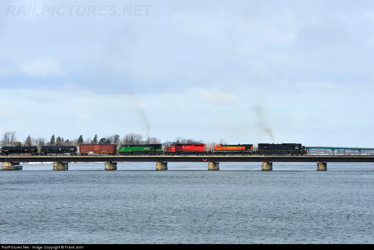 Bound for the Irving Refinery at Saint John N.B, Montreal Maine & Atlantic `fuel train`` heads toward Farnham as it rumbles across the Richelieu River.