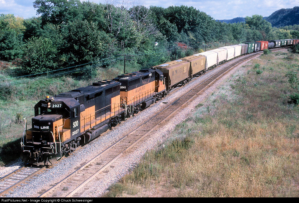 | Soo 2027 leads a still decent looking Milwaukee 2041 west near Lake City. After all the black paint treatment most of the Ex Milwaukee units took on a fairly unattractive appearance and they ran around for years upon years in their "bandit" paint scheme. |