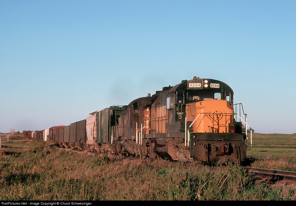| CNW Alcos roll along near Springfield in 1980. Before long the 1st generation Alco's would be retired and the more modern units like 4244 would be transferred east to work CNW lines in Wisconsin and Upper Michigan. Photo from my collection, no photographer listed. |