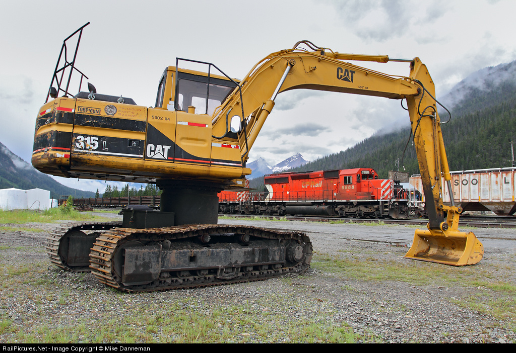 Canadian Pacific Railway Caterpillar 315 L No. 5502 04 nicely frames CP SD40-2 No. 5868 sitting near the depot at Field, British Columbia, on July 18, 2011.