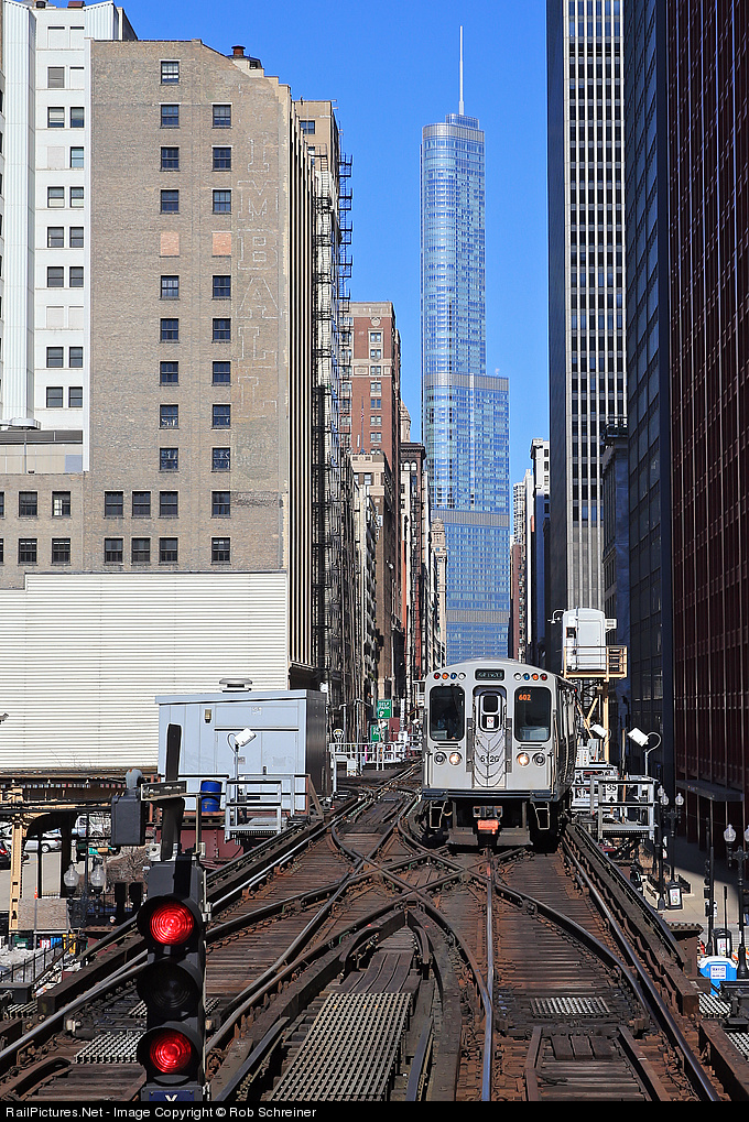 A Green Line train crosses over in front of us at Tower 12 on its way to Ashland / 63 ST. Trump Tower stands in the distance.
