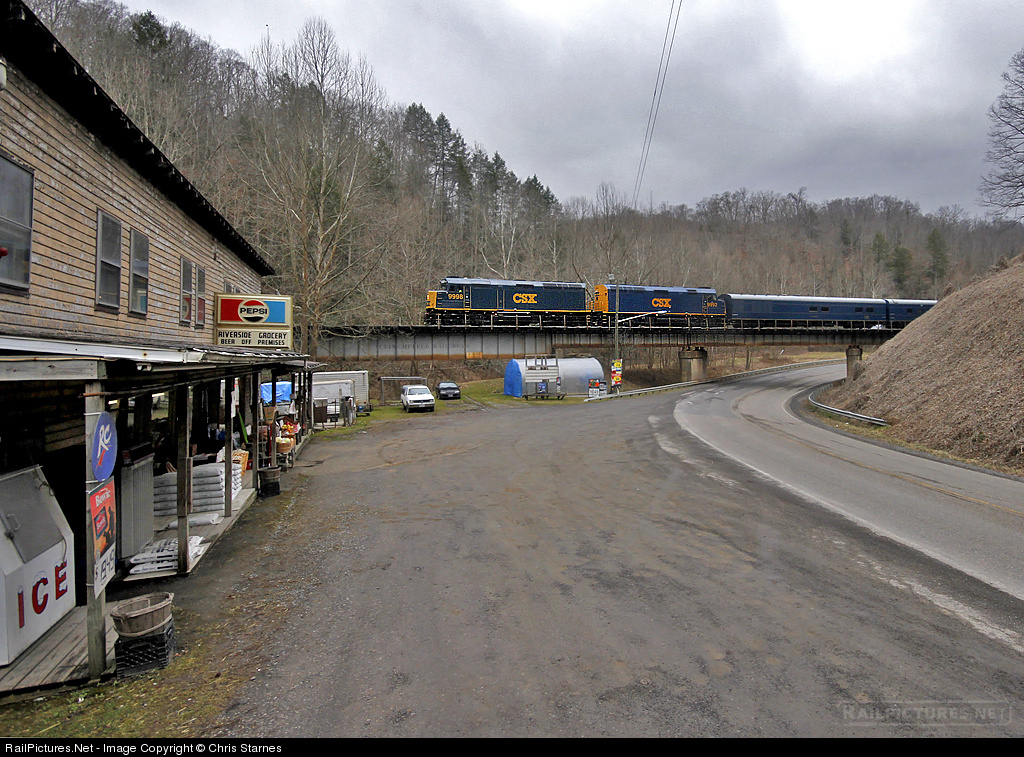 | CSX F40s 9998 and 9992 lead southbound train P955 across Highway 83/63 and by Riverside Grocery at Clinchco on the north end of the former Clinchfield Railroad with a Russell, KY to Erwin, TN Office Car Special. |