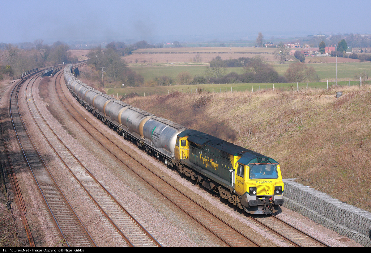 | Freightliner Heavy Haul cement 6L45 07.35 Earles Sdgs - West Thurrock passes Southbound on the Midland Main Line & through the misty Great Ouse Valley with GE Powerhaul Class 70 No. 70011 in charge. |