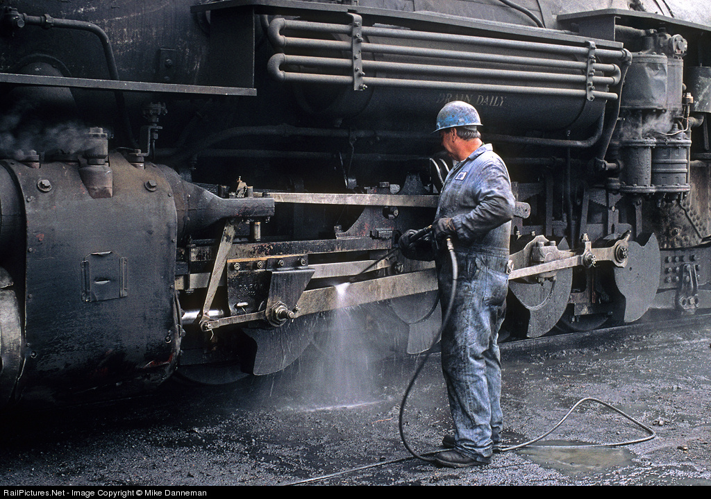 A roundhouse laborer cleans off accumulated grease and dirt from the running gear of Cumbres and Toltec Scenic Railroad K-37 No. 497 at Chama, New Mexico, on the evening of May 24, 1999.
