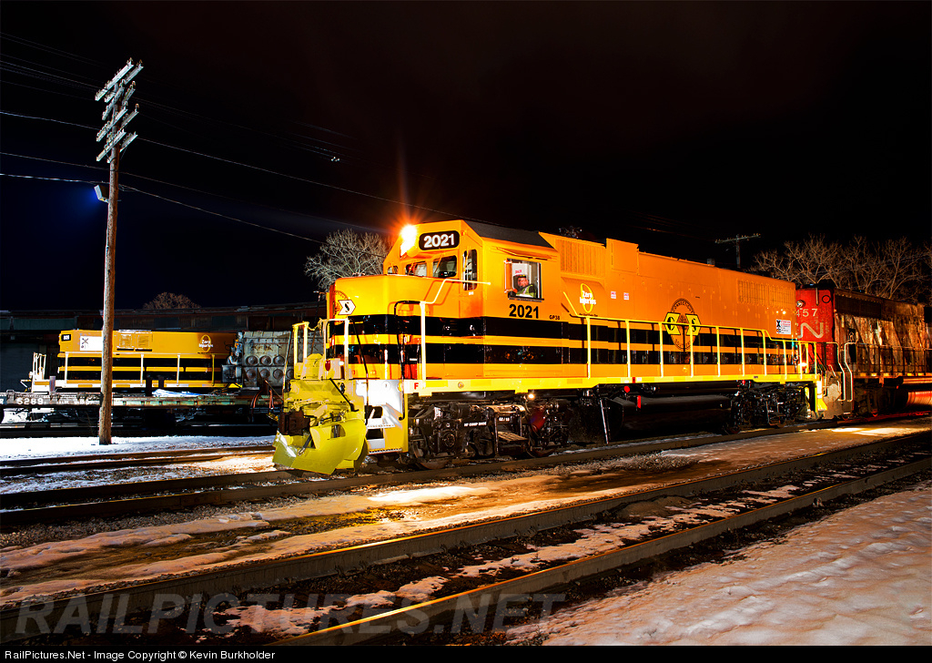 | Fresh out of the paint booth and from rewiring, the Connecticut Southern GP38 2021 is the first of its kind, as no previous locomotive has worn a true Connecticut Southern scheme and logo before this Genesee & Wyoming repaint of former New England Central GP38 3849. The unit has cab signals and LSL equipment installed - LSL light noted on the frame just ahead and below the cab on the sill. In the background is the NECR MT-4 slug 809 (formerly CORP RP-E4 4165). |